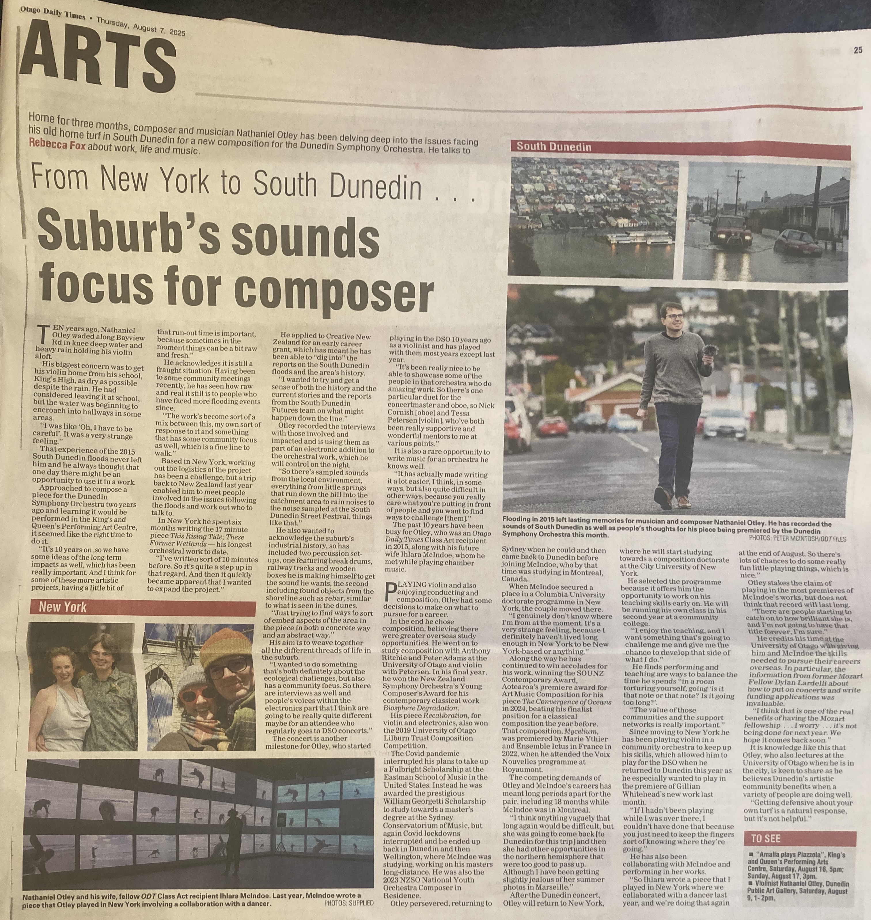 From pretty much the moment I got back to New York in mid February until the last few weeks of December things became so busy they remain a bit of a blur. Once home, I gradually settled into the home stretch of writing this rising tide, these former wetlands a 20 minute work for orchestra and sampler for the Dunedin Symphony Orchestra that explored ideas of adverse weather and its impacts in South Dunedin, New Zealand. This was a really interesting piece to compose. It is the longest orchestral work I have ever written and I found that the freedom and possibility this provided was even greater than I anticipated. The fact the piece was so deeply informed by background ecological and community research in South Dunedin also made the project expansive, slippery, and often difficult to comprehend. I often felt as though through building such an expansive project I lost all ability to see it as a whole, as if I was on the ground in the middle of a large landscape, an unexpected and exciting new experience. It was also strange writing so much of a work so grounded in memory and place away from that place, but having done research both archival and on the ground in late 2024, I had many material and personal connections that I was able to sit with and deeply consider. Writing for the Dunedin Symphony Orchestra, an orchestra I grew up listening to and have played in so many times was also a very meaningful experience. There was so much I wanted to highlight in the orchestra right from the outset of writing and many of the most meaningful moments in the piece were developed out of this knowledge, including the concertmaster and principle oboe solos for important mentors and friends Tessa Petersen and Nick Cornish. I’m incredibly grateful to the Dunedin Symphony Orchestra and Philippa Harris for asking for the piece and to the APRA Art Music Fund and the Creative New Zealand Early Career fund for their support for the works creation and background research respectively.